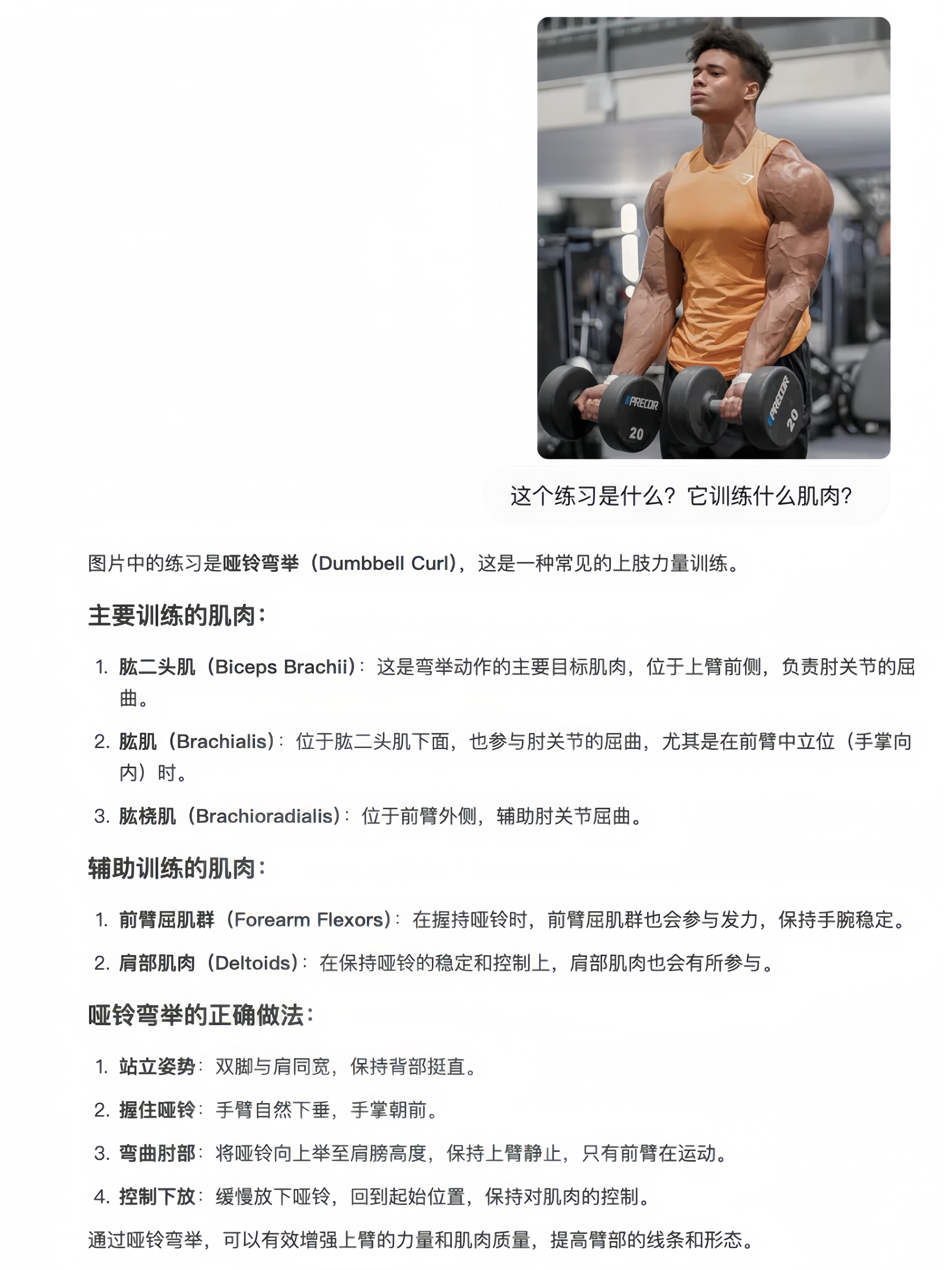 私人教练和健身教练的费用很高,现在您可以要求人工智能为您提供量身定制的锻炼计划,解释如何进行特定的锻炼,或者识别锻炼的名称和涉及的肌肉,就像下面的照片一样