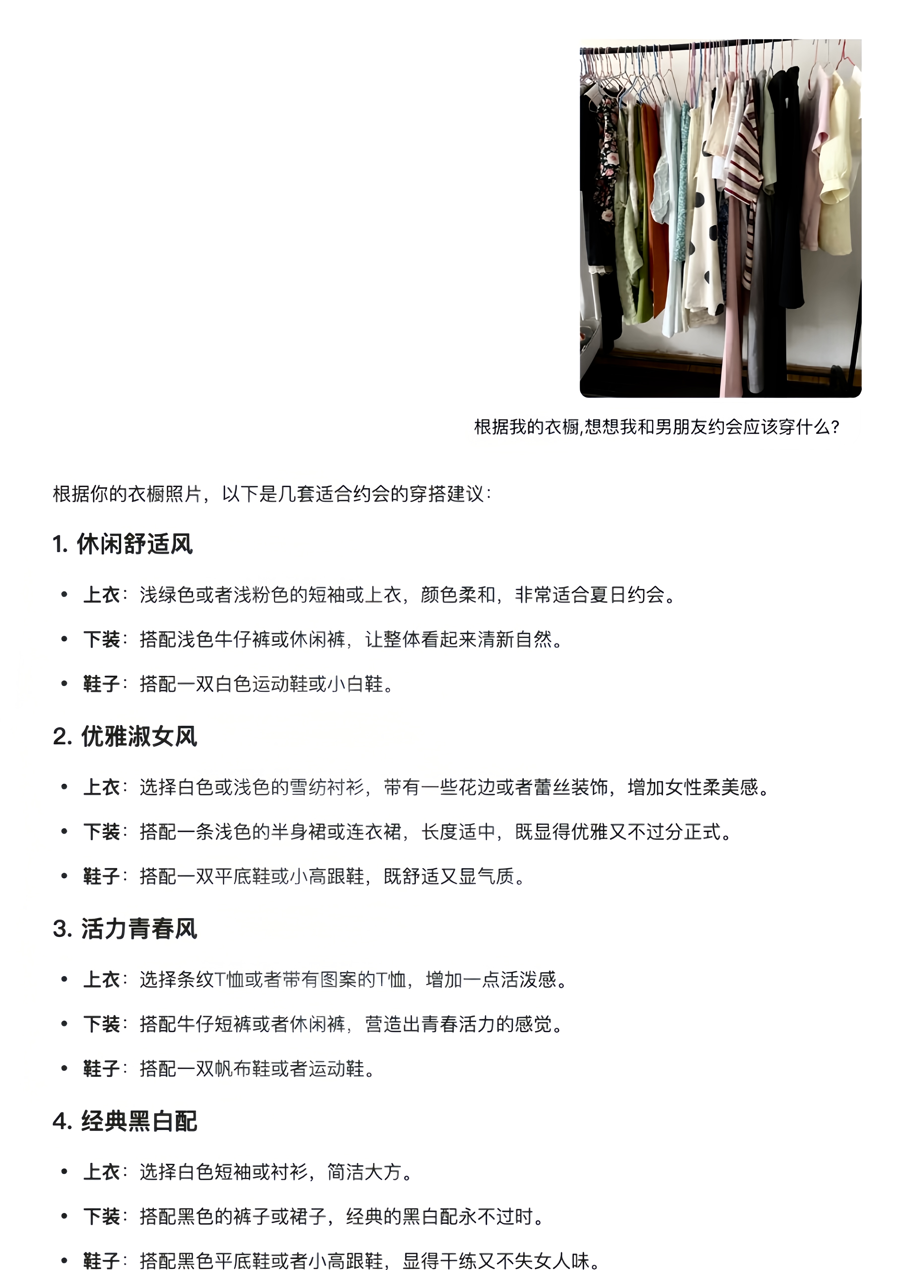要去约会却不知道穿什么?别担心,你的好朋友 GPT-4o 也是一位时尚顾问!给你的衣橱拍张照片,然后向人工智能寻求建议。你一定会对 GPT-4o 出色的时尚顾问印象深刻
