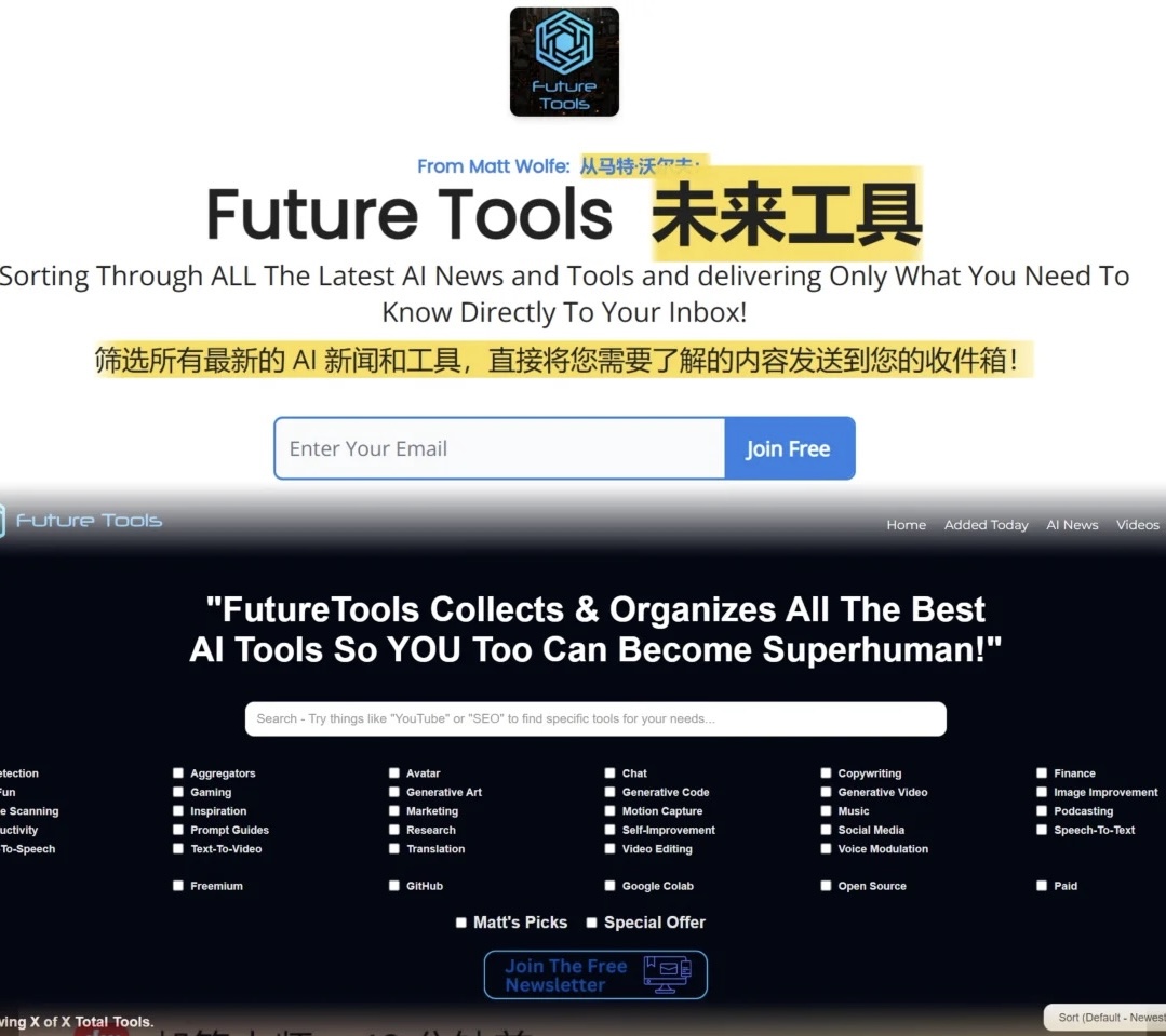 2. Future Tools:工具分类逻辑清晰,能帮你跳过冗余信息,快速定位当下热门AI工具;支持免费订阅邮件,可直接接收工具更新动态,无需频繁手动检索。