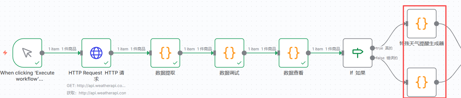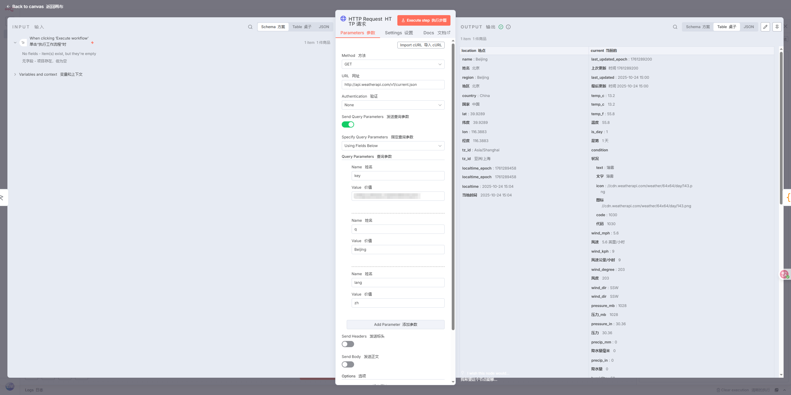 以上,整个获取天气的工作流就完成了,我们来测试一下: