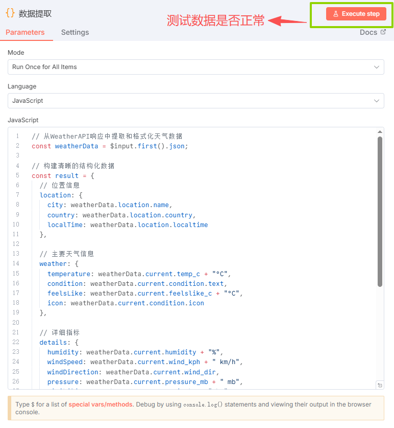 节点作用:配置Code代码节点将原始 API 的天气数据提取出来,并转换为能呈现的业务数据