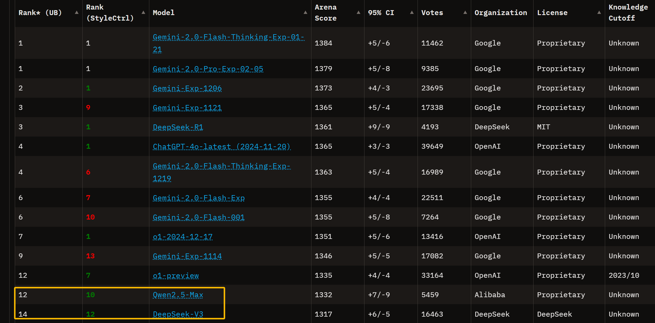 Qwen2.5-Max 其实也是类似于 DeepSeek-V3 的基础模型,而 Qwen2.5-Max 的比 DeepSeek-V3 的智商还高,在 Chatbot Arena【大模型盲测绑定】 上排名 几乎把很多 开源、闭源、前沿非推理模型都比了下去,如下: