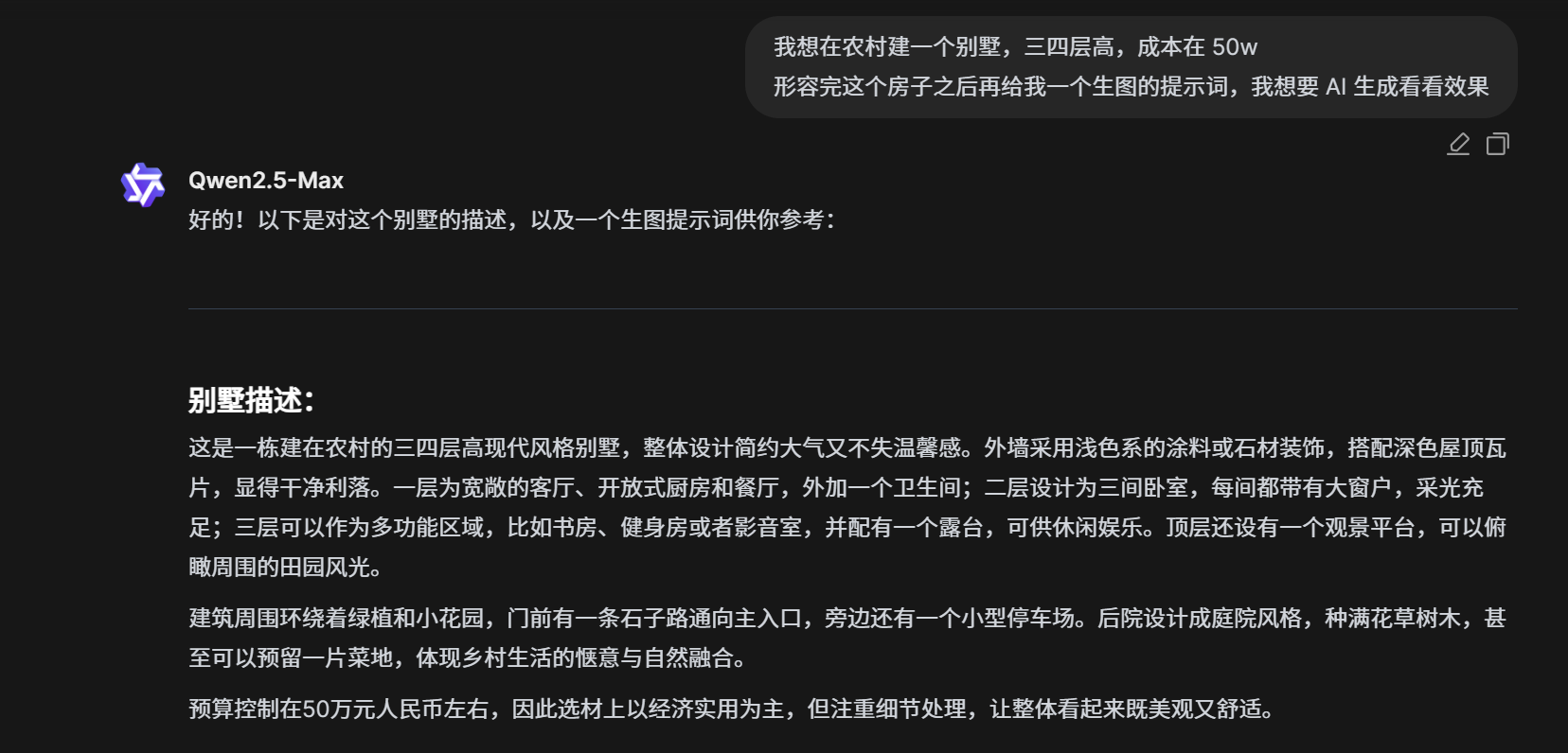 看了上面的功能,其实我们就可以让 AI 帮我们生成一些不知道怎么描述的图片,比如:装修图,可以先让 AI 给我们生成提示词,然后再用 AI 生成图片