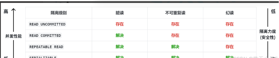 出现在事务的 READ UNCOMMITTED 隔离级别下,由于在读取数据时不做任何限制,所以并发性能很高,但是会出现大量的数据安全问题,比如在事务A中执行了⼀条 INSERT 语句,在没有执行COMMIT 的情况下,会在事务B中被读取到,此时如果事务A执行回滚操作,那么事务B中读取到事务A写入的数据将没有意义,我们把这个理象叫做 "脏读"。
