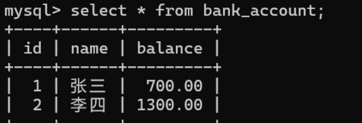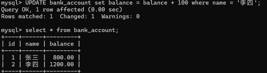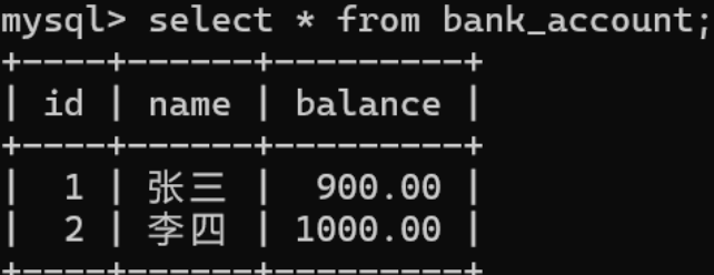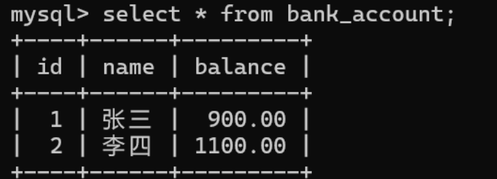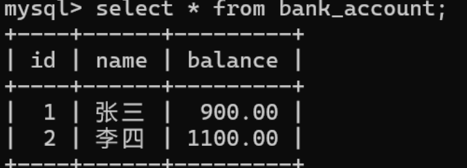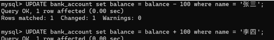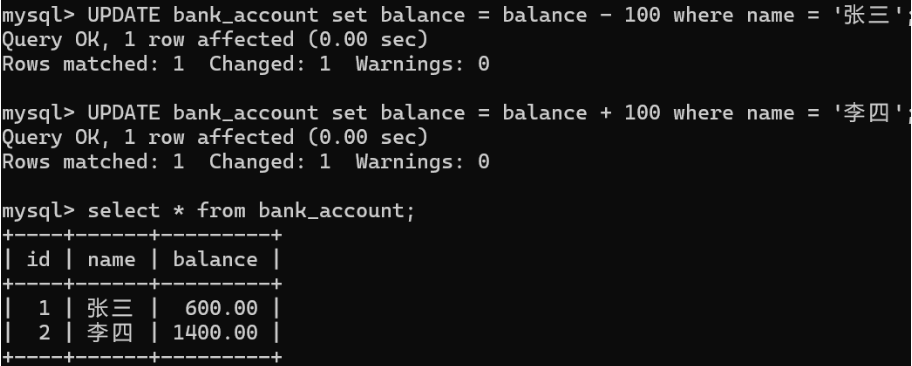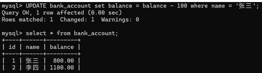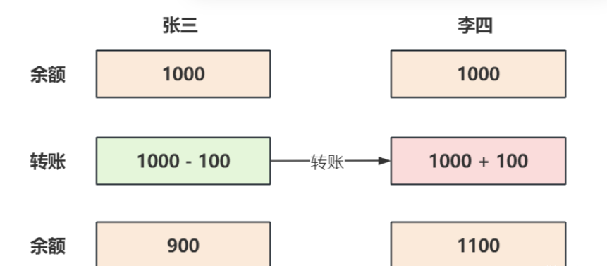 1. 张三的账户余额减少 100 ,变成 900 ,李四的账户余额增加了 100 ,变成 1100 ,不能出现张三的余额减少而李四的余额没有增加的情况;