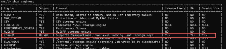 要使用事务那么数据库就要支持事务,在MySQL中支持事务的存储引擎是InnoDB,可以通过show engines;语句查看:
