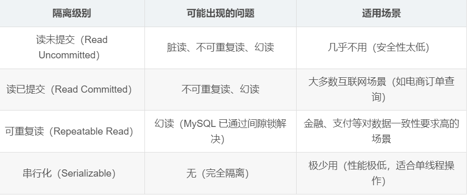 - 幻读:事务B查询"工资>5000的员工数"是10人,事务A新增了一个工资6000的员工并提交;事务B再次查询,结果变成11人——像出现了"幻觉"。