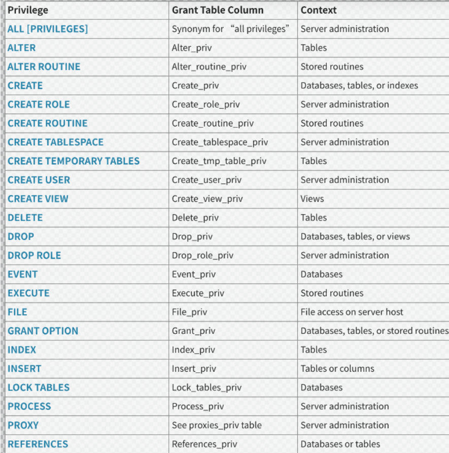 - 管理权限:`GRANT OPTION`(授权他人)、`SUPER`(超级权限)、`SHUTDOWN`(关闭服务)
