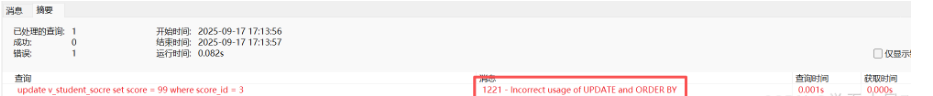 可以发现更新失败,因为创建视图时使⽤了order by 语句