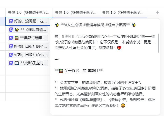 举个例子,如果你需要推广10本书籍,传统方式可能需要你花费一整天来完成文案创作。但是,通过豆包,几分钟内就能批量生成100篇甚至更多的宣传文案,且每一篇文案都符合平台发布规范。