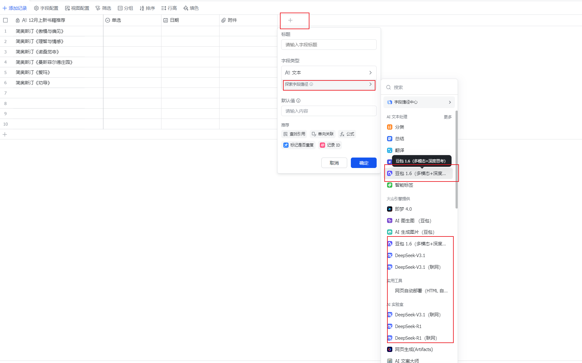 接下来,在飞书多维表格中,点击表格的第一行后面的【+】号,选择【搜索字段捷径】为【豆包1.6】。这一步是将豆包的AI功能与飞书表格结合,进行文案创作的关键。当然,如果你偏好其他AI,还有其他工具可以选择。
