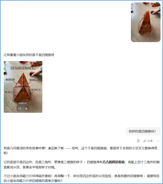 儿子眼睛一亮,立刻以一个正方形做底,搭了一个尖尖的东西。但是由于拍照角度的问题,AI识别出来不是四棱锥,于是我换了一个角度拍照,并用语音形容了一下他是用什么形状拼搭的,最后AI成功识别出四棱锥并对小朋友进行了鼓励。