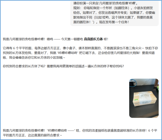 怪兽说想吃 “直直的长方体”。儿子环顾四周,把目光锁定了桌上的抽纸盒。我帮他拍了照发过去。