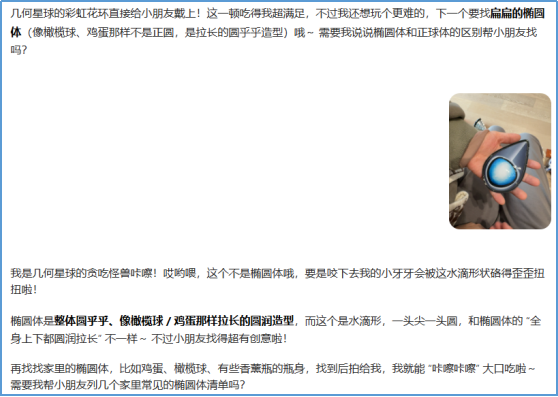 怪兽说想吃 “扁扁的椭圆体”(像橄榄球)。儿子找来了一个蓝色的水滴形状玩具。这在孩子眼里其实挺像椭圆的,但AI给出了非常精准的辨析。