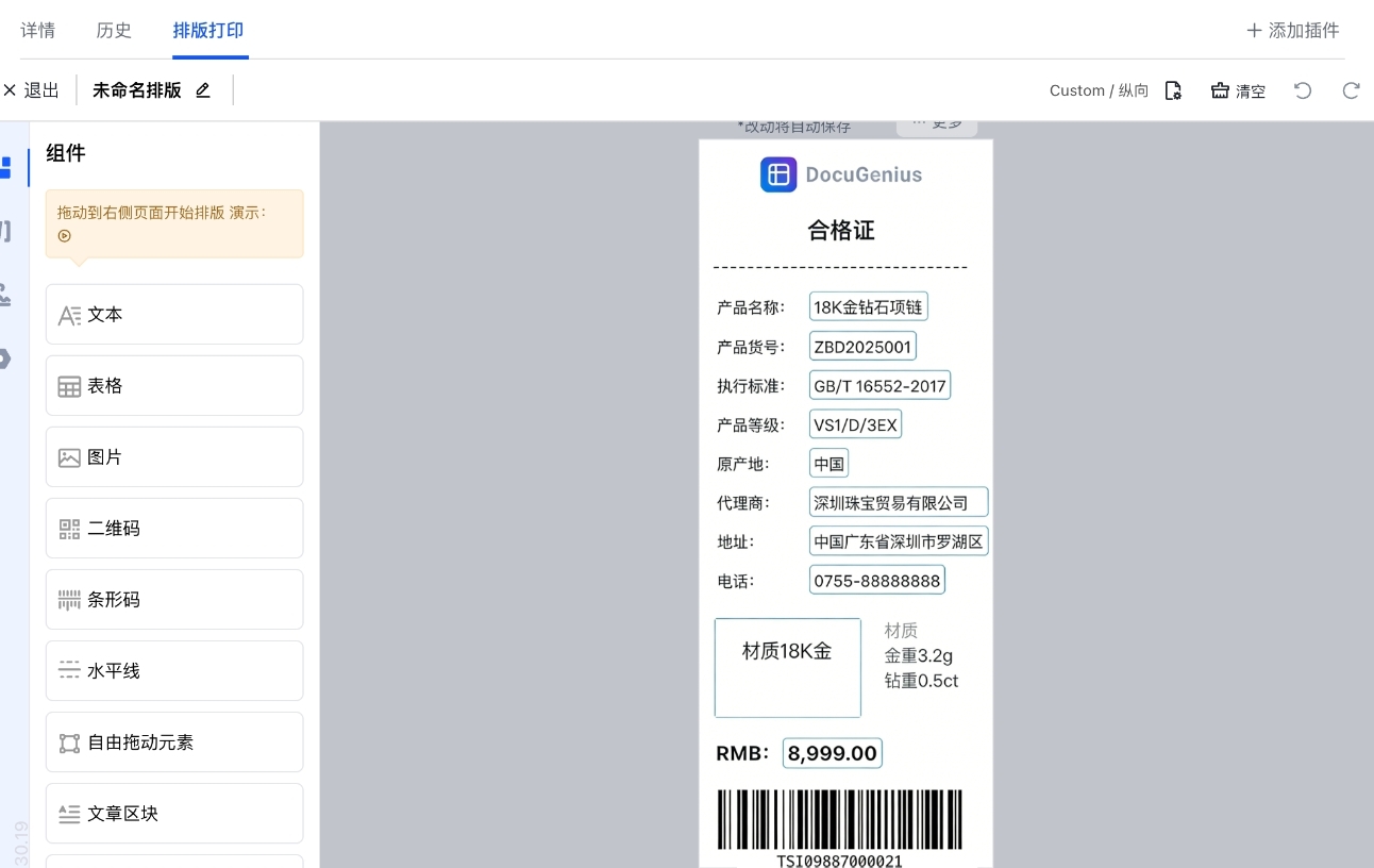 不管是批量上新的爆款首饰,还是一对一专属定制的珠宝单品,多维表格「排版打印」插件都能精准匹配你的标签打印需求 —— 既省去手工录入的时间成本,让产品管理效率翻倍,更能通过标准化标签形象,助力品牌竞争力稳步升级。