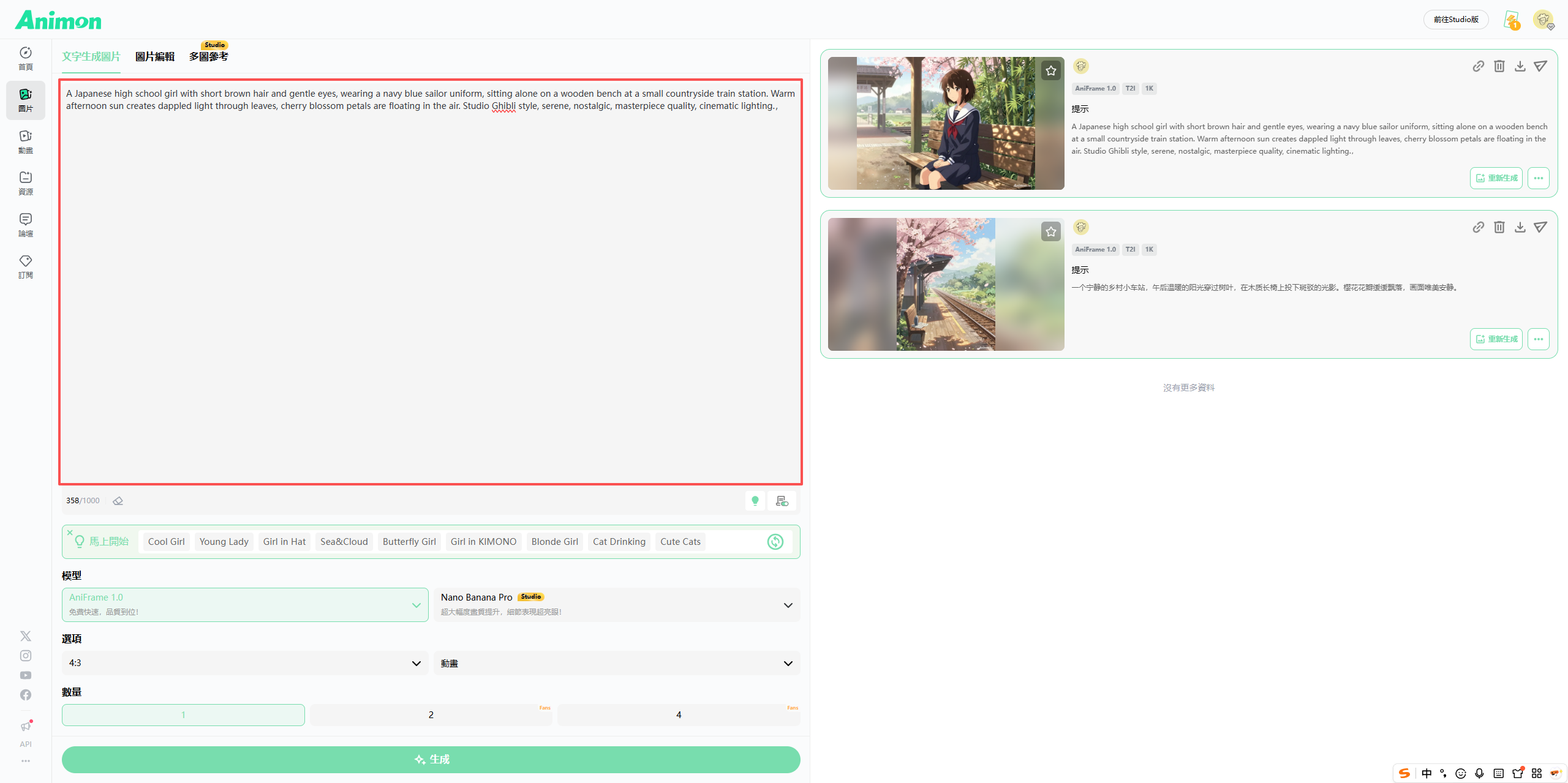 在描述框里,输入你想要画面的关键词。比如,我想要一个女孩独自坐在乡村小车站的木制长椅上,我就写:“A Japanese high school girl with short brown hair and gentle eyes, wearing a navy blue sailor uniform, sitting alone on a wooden bench at a small countryside train station. Warm afternoon sun creates dappled light through leaves, cherry blossom petals are floating in the air. Studio Ghibli style, serene, nostalgic, masterpiece quality, cinematic lighting.(中文提示词:一个日本女高中生,棕色短发,眼神温柔,穿着深蓝色水手服,独自坐在乡村小车站的木制长椅上。午后温暖的阳光透过树叶形成斑驳光影,樱花花瓣在空中飘浮。吉卜力风格,宁静,怀旧,大师品质,电影感灯光。)”