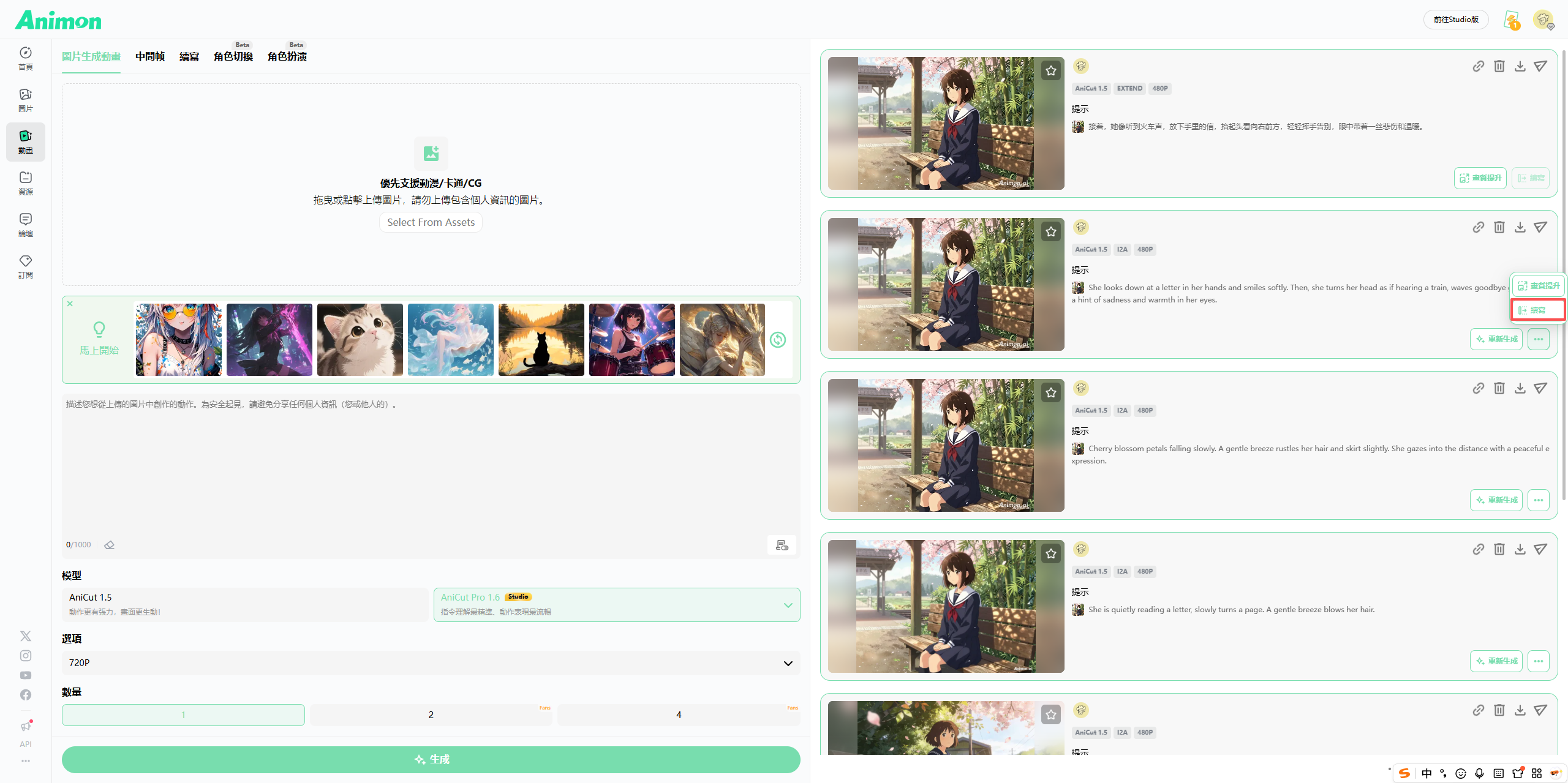 它最牛的核心功能,也是我今天要重点说的,就是 “视频续写” 。这功能解决了AI做视频的一个老大难问题:不连贯。对于视频新手来说,前后秒的连贯性很重要,制作起来也很费时间。但 Animoon 的“续写功能”,能让你生成的下一段视频,稳稳地接住上一段的结尾,人物、风格、剧情都能连贯上,这才是能讲故事的真正动画!