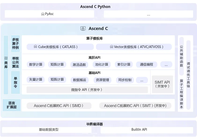 Ascend C的定位:Ascend C是面向昇腾AI处理器算子开发的专用编程语言,通过多层级API设计,既提供了底层硬件的控制能力,又通过高阶API降低了开发门槛。