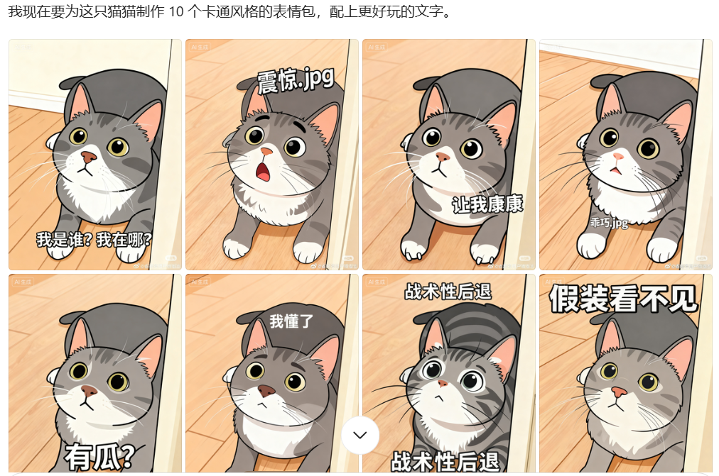 豆包指令:生成10个猫猫的表情包,图上需要带有简洁犀利搞笑的文字