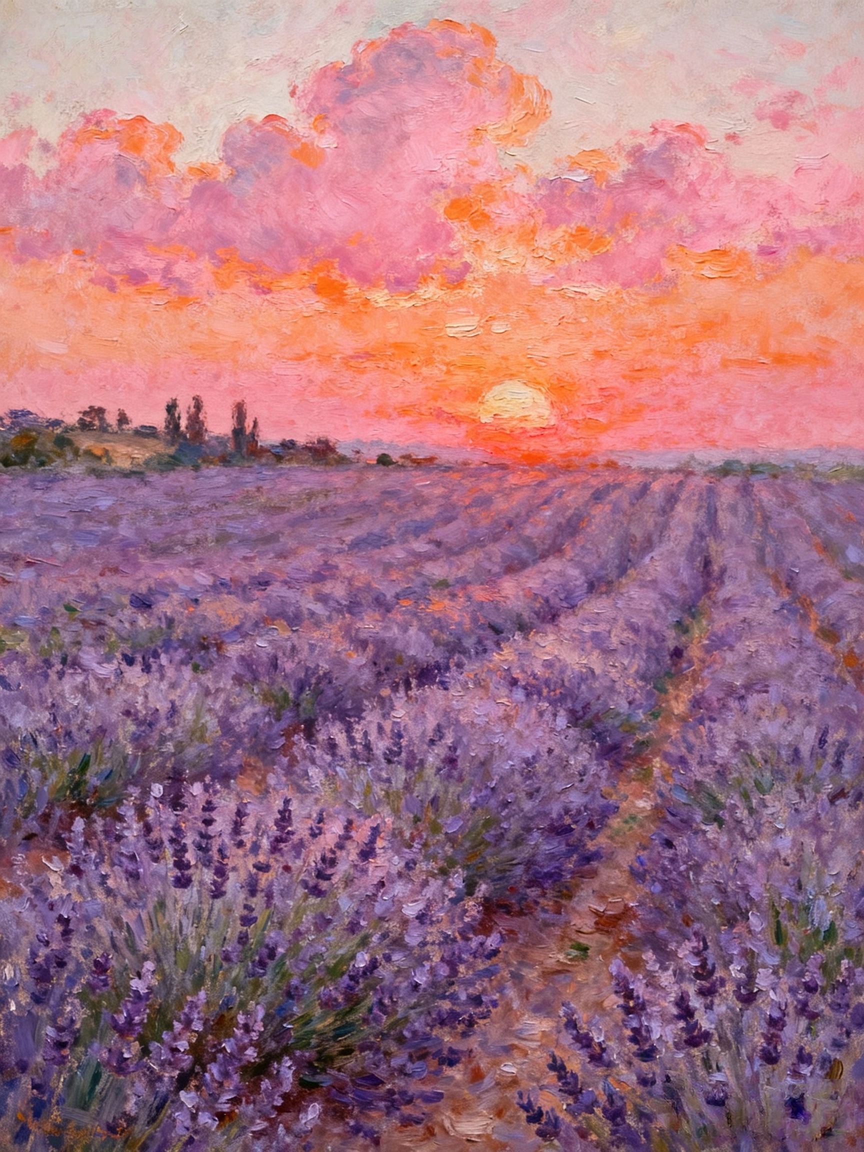 提示词模板:“普罗旺斯薰衣草田,夕阳将云层染成橘粉,笔触如莫奈《日出》般松散,高饱和度低对比度”