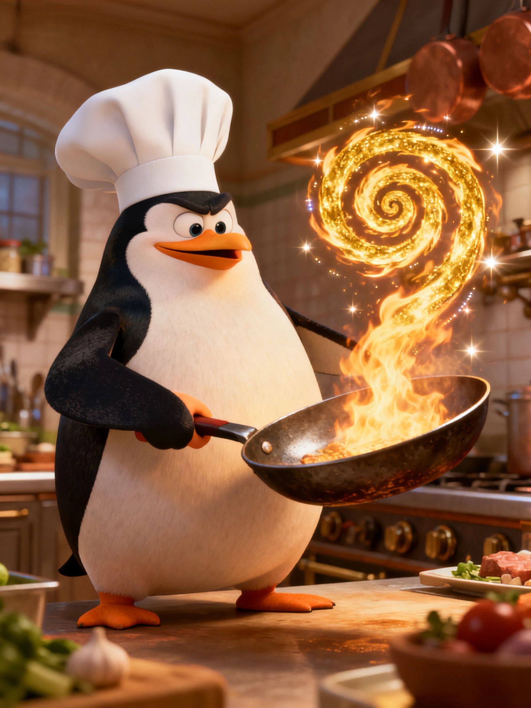 提示词模板:“胖企鹅厨师戴着高帽颠勺,火焰呈金色螺旋上升,迪士尼《料理鼠王》角色设计,3D渲染”