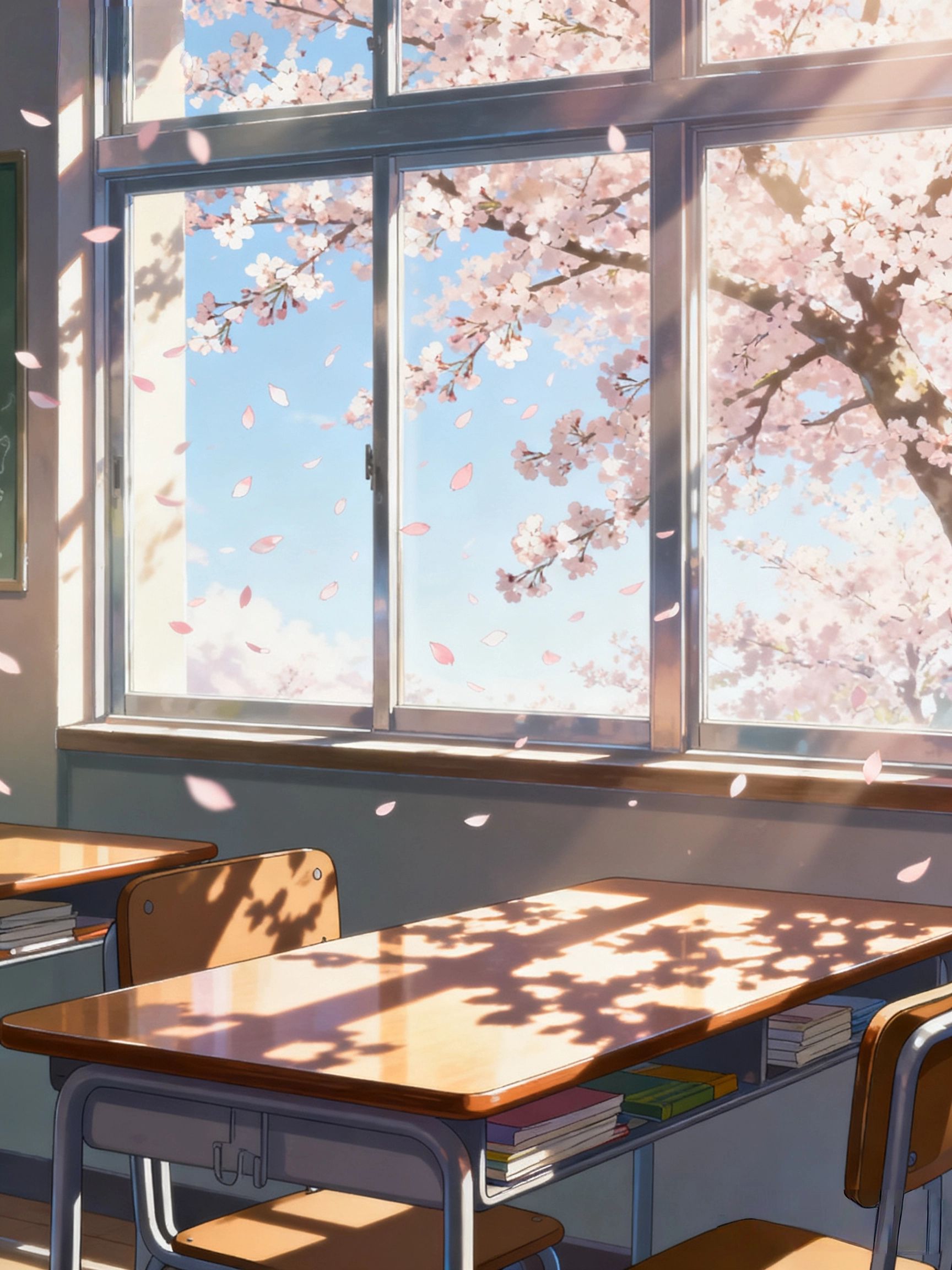 提示词模板:“晨读教室,阳光在课桌刻下斑驳树影,窗外樱花飘落速度0.5倍,4K高清,新海诚《秒速5厘米》滤镜”