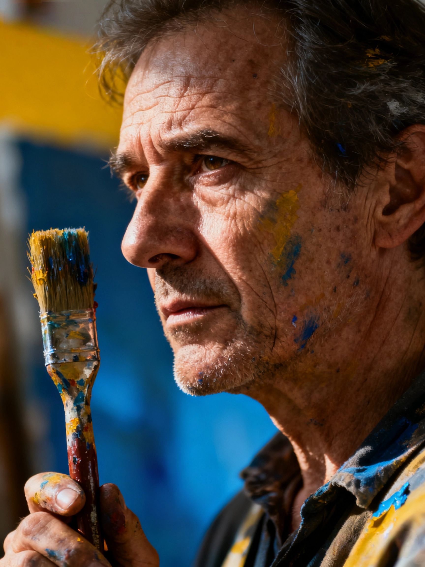 提示词模板:“中年画家握着沾满颜料的画笔,眼神疲惫却坚定,侧脸光影对比强烈,50mm定焦镜头,自然光,肖像摄影”