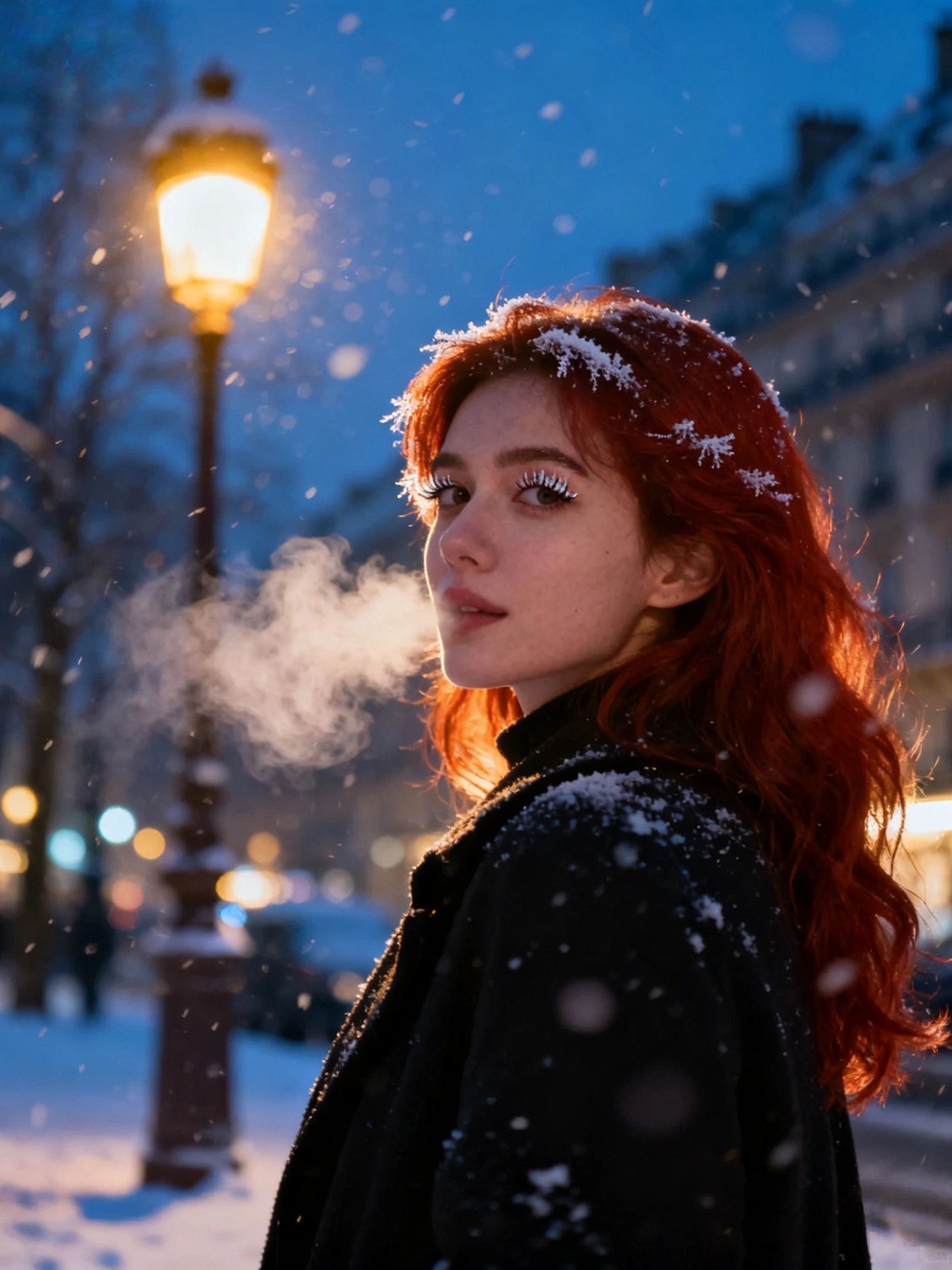 提示词模板:“雪夜中的巴黎街头,一位红发女子侧身回望,睫毛结霜,哈气在冷空气中形成白雾,8K分辨率,f/2.2光圈,逆光拍摄”
