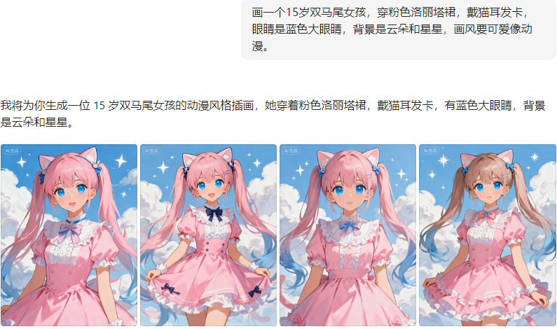 👉 指令:“画一个15岁双马尾女孩,穿粉色洛丽塔裙,戴猫耳发卡,眼睛是蓝色大眼睛,背景是云朵和星星,画风要可爱像动漫。”