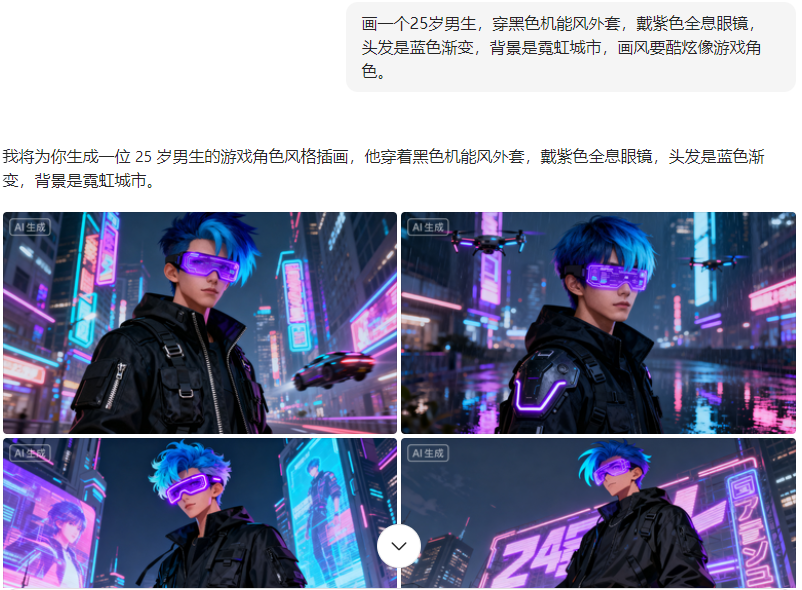 👉 指令:“画一个25岁男生,穿黑色机能风外套,戴紫色全息眼镜,头发是蓝色渐变,背景是霓虹城市,画风要酷炫像游戏角色。”