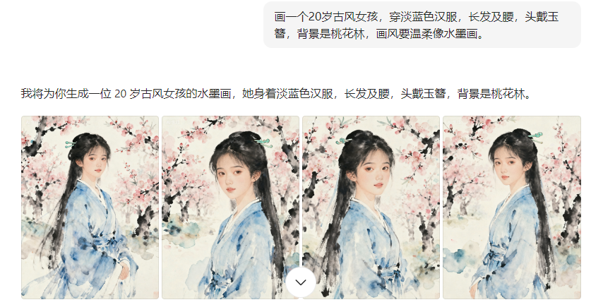 👉 指令:“画一个20岁古风女孩,穿淡蓝色汉服,长发及腰,头戴玉簪,背景是桃花林,画风要温柔像水墨画。”