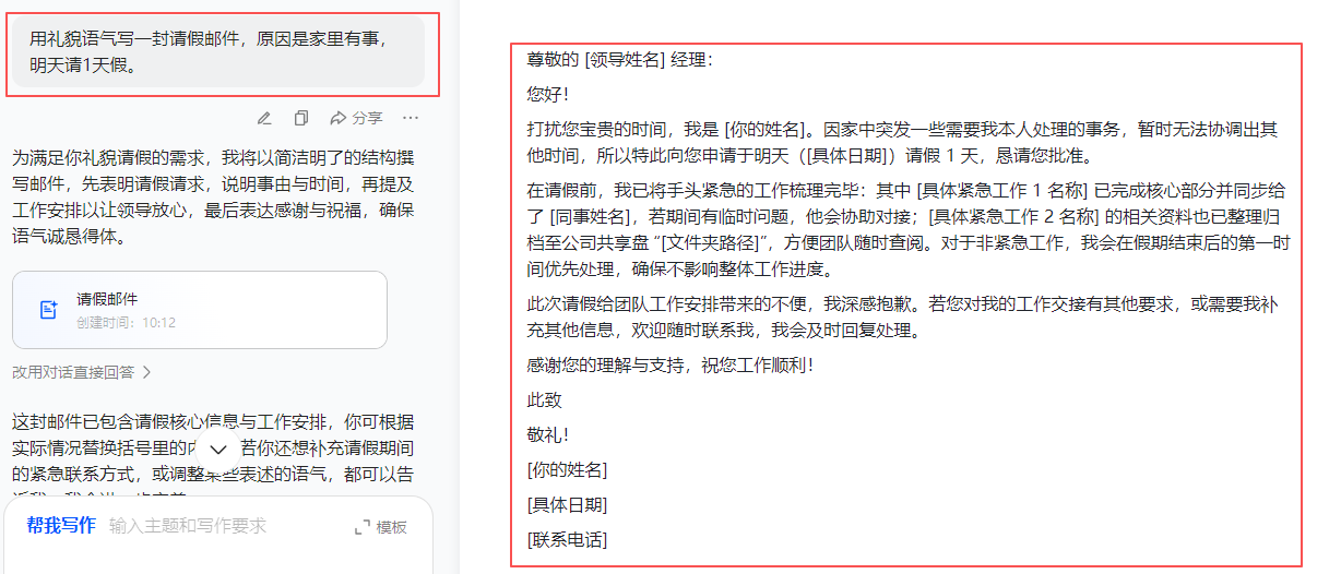 📧 “用礼貌语气写一封请假邮件,原因是家里有事,明天请1天假。”