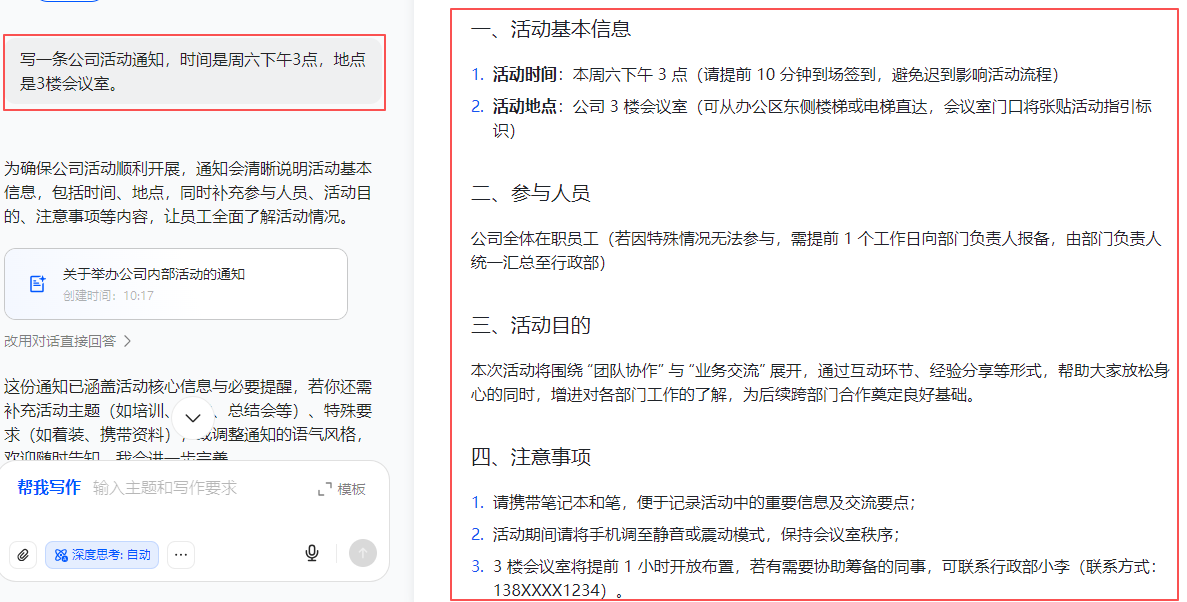 📢 “写一条公司活动通知,时间是周六下午3点,地点是3楼会议室。”