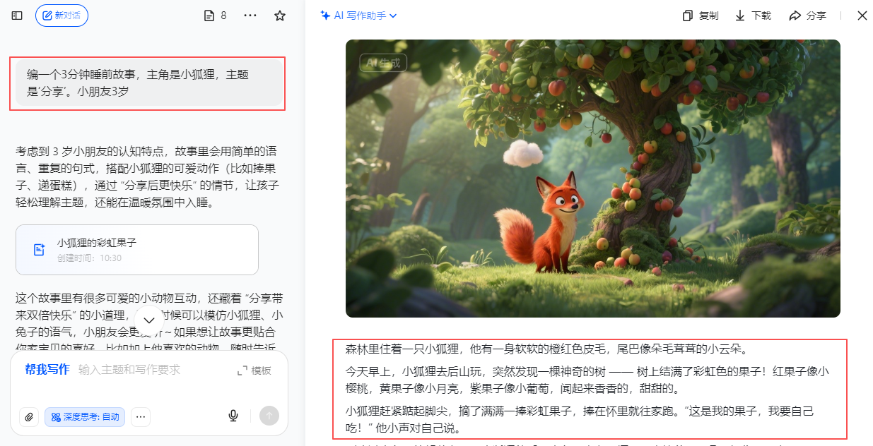👶 “编一个3分钟睡前故事,主角是小狐狸,主题是‘分享’。”