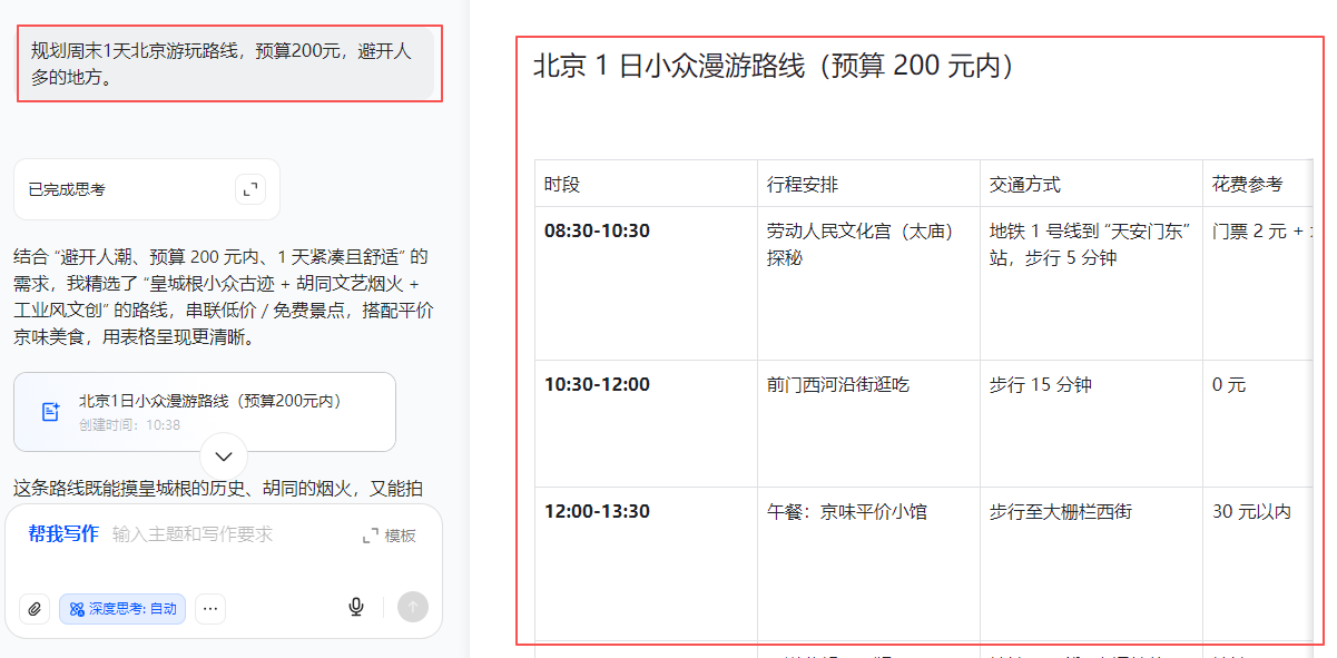 🗓️ “规划周末1天北京游玩路线,预算200元,避开人多的地方。”