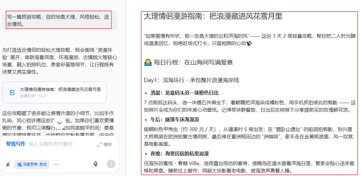 👉 例:“写一篇旅游攻略,目的地是大理,风格轻松,适合情侣。”