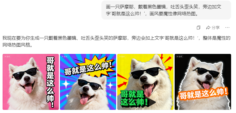 👉 指令:“画一只萨摩耶,戴着黑色墨镜,吐舌头歪头笑,旁边加文字‘哥就是这么帅!’,画风要魔性像网络热图。”