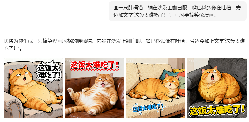👉 指令:“画一只胖橘猫,躺在沙发上翻白眼,嘴巴微张像在吐槽,旁边加文字‘这饭太难吃了!’,画风要搞笑像漫画。”