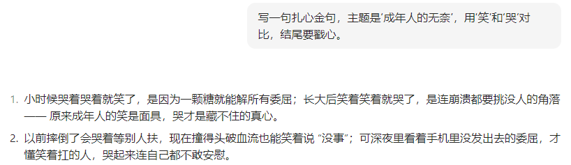 👉 指令:“写一句扎心金句,主题是‘成年人的无奈’,用‘笑’和‘哭’对比,结尾要戳心。”