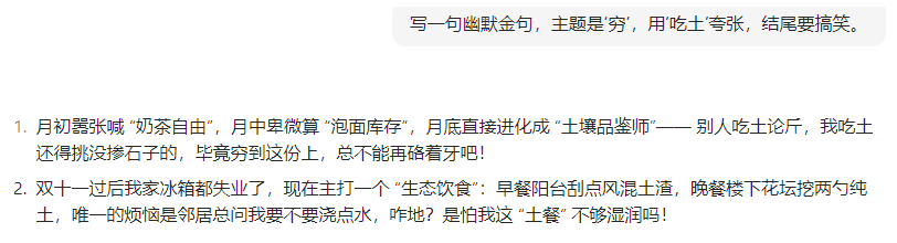 👉 指令:“写一句幽默金句,主题是‘穷’,用‘吃土’夸张,结尾要搞笑。”