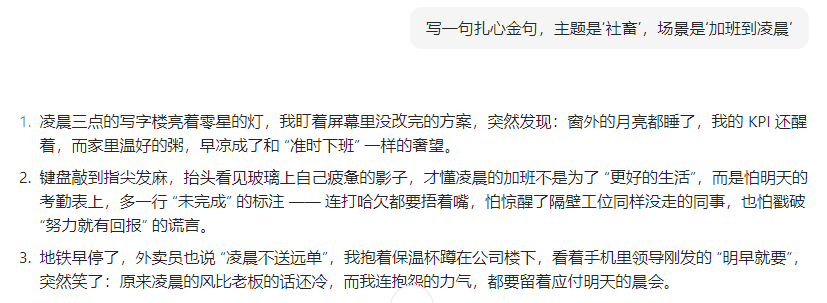 👉 指令:“写一句扎心金句,主题是‘社畜’,场景是‘加班到凌晨’。”