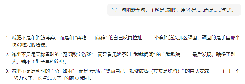 👉 指令:“写一句幽默金句,主题是‘减肥’,用‘不是……而是……’句式。”