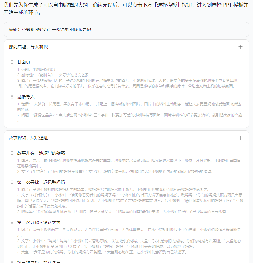 它会根据你提供的内容进行生成,并会反馈给你PPT大纲,若内容无误后,选择下方的模板进行生成。