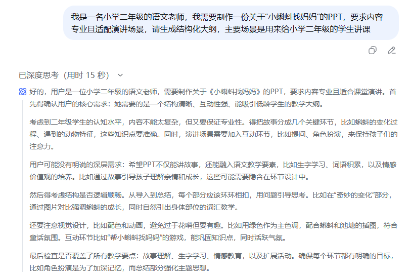 文章介绍用 DeepSeek 生成 PPT 教案的方法,助教师告别“熬夜改教案”。第一步用 DeepSeek 提问,如以小学二年级语文“小蝌蚪找妈妈”为例提出需求;第二步用 AI 工具生成 PPT,推荐豆包 AI PPT 和 Kimi PPT 助手,将 DeepSeek 生成的大纲粘贴进去,选模板生成。强调 AI 是放大老师能力,而非替代。