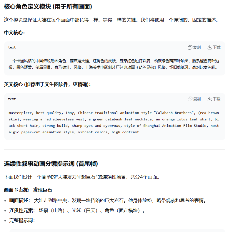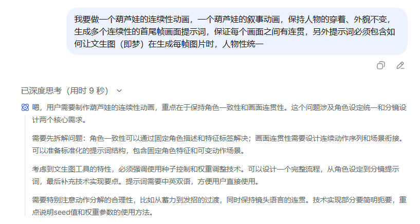 “我要做一个葫芦娃的连续性动画,一个葫芦娃的叙事动画,保持人物的穿着、外貌不变,生成多个连续性的首尾帧画面提示词,保证每个画面之间有连贯,另外提示词必须包含如何让文生图(即梦)在生成每帧图片时,人物性统一”(直接复制提示词,修改名称,你也可以做其他动画出来)