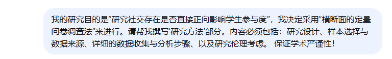 “我的研究目的是[研究问题],我决定采用[具体方法,比如:实验研究]来进行。请帮我撰写‘研究方法’部分。内容必须包括:研究设计、样本选择与数据来源、详细的数据收集与分析步骤、以及研究伦理考虑。 保证学术严谨性!”