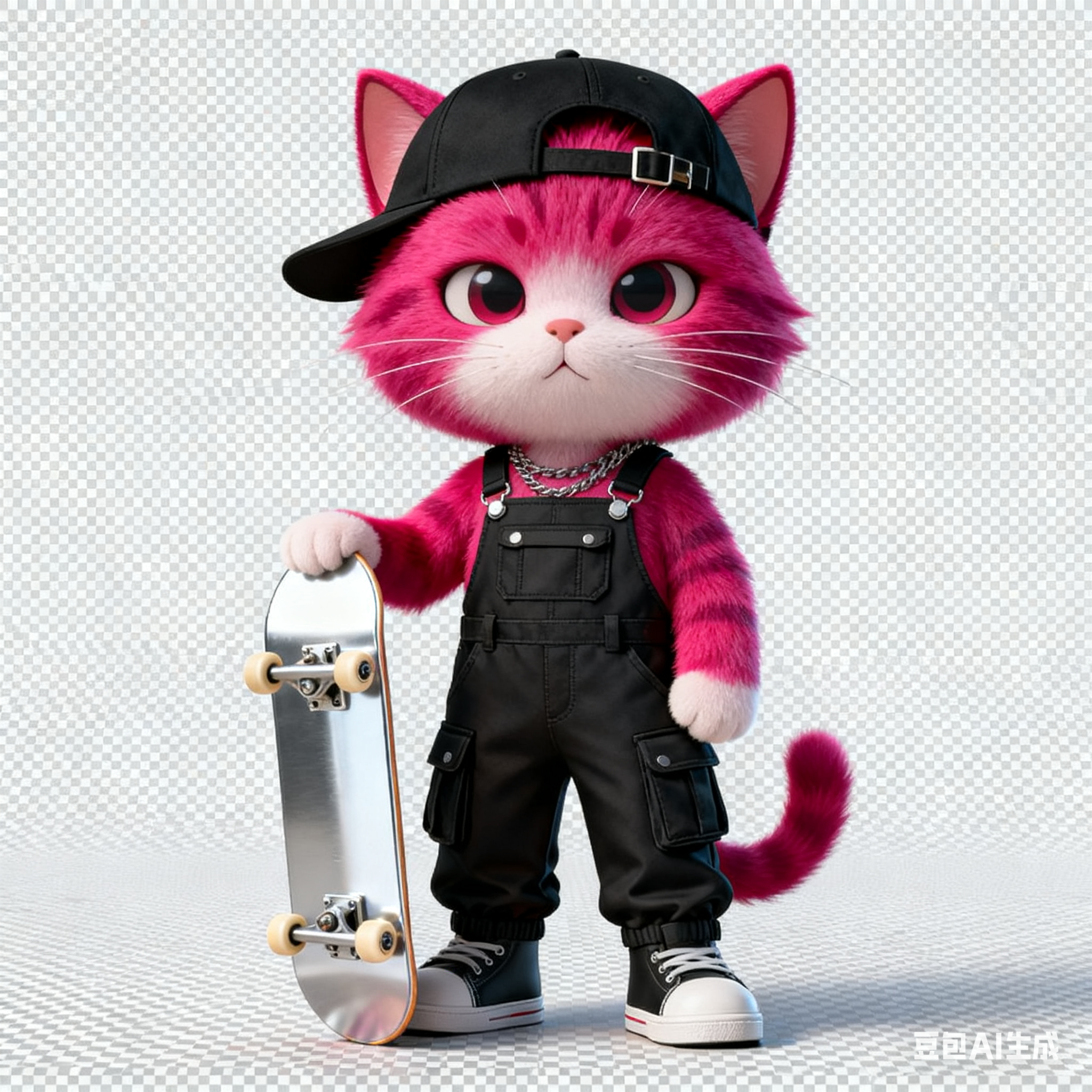 “商业海报用猫咪 IP 形象,潮酷街头风格(参考 Supreme 插画质感),玫红色短毛猫,头身比例 1:3,戴黑色刺绣棒球帽(帽檐有银色 logo),穿多口袋工装裤,单手持银色涂鸦滑板(板面带黑色箭头与星星图案),站姿(重心偏右,肢体舒展),光影为左上方打光,立体感强,边缘锐利,高清细节,无杂物元素”