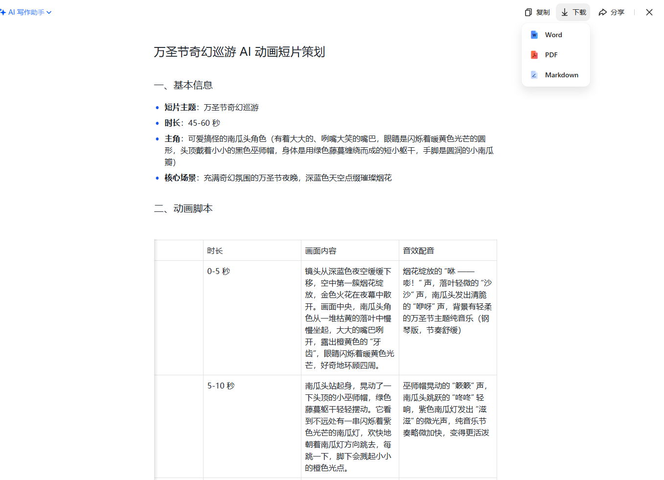 帮我写一个万圣节奇幻巡游主题的 AI 动画短片策划,时长控制在 45-60 秒。主角是可爱的南瓜头角色。确保脚本包含序号、时长、画面内容、音效配音四大核心部分。