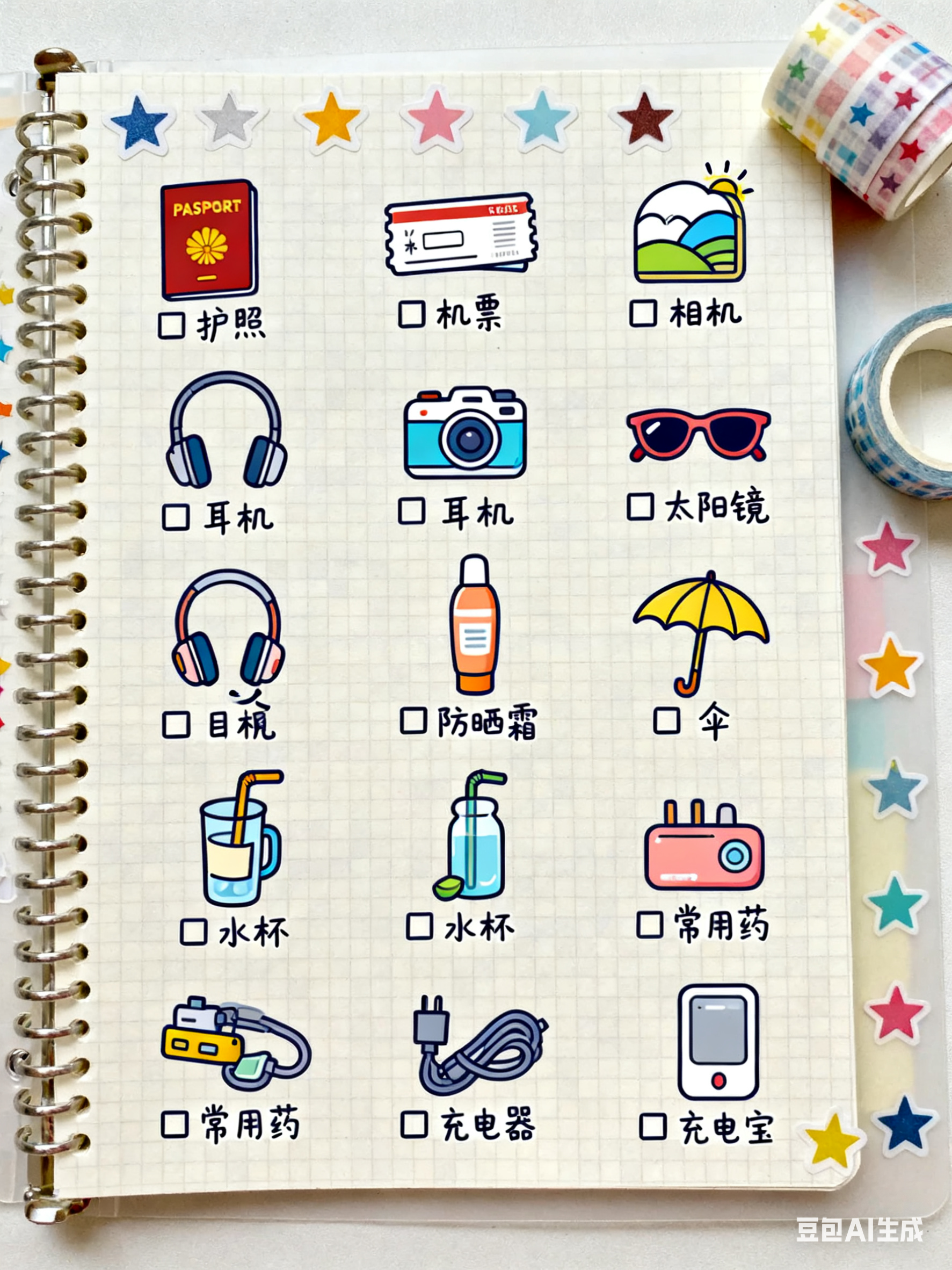 画面:在网格背景的笔记本页面上,画满小图标:护照、机票、相机、耳机、太阳镜、防晒霜、伞、水杯、常用药充电器、充电宝。