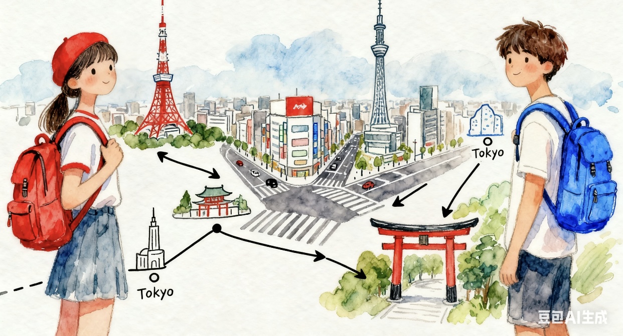 提示词 :一张水彩+彩铅风格的【东京旅行地图】